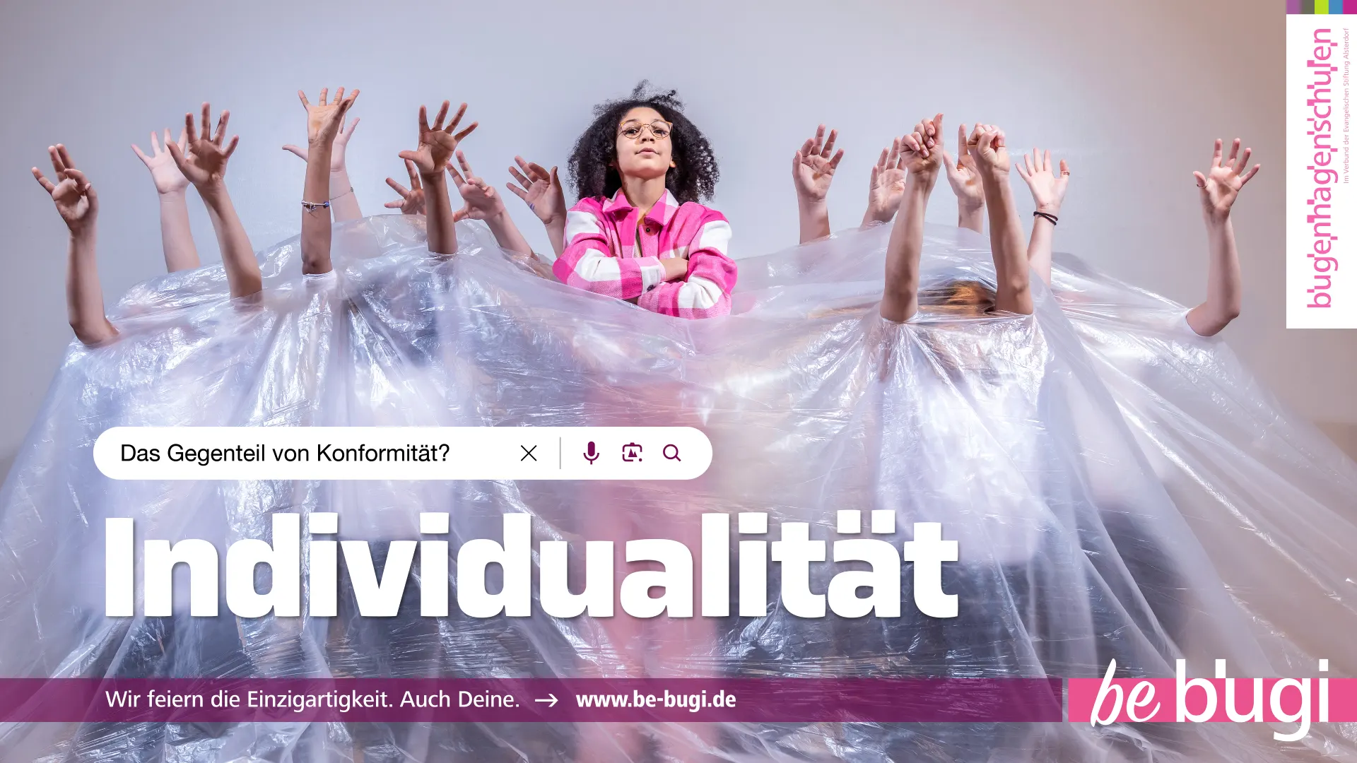 Über 80 Schüler:innen meldeten sich zum Shooting an, das nicht nur für die Erstellung der Kampagnenmotive genutzt wurde, sondern auch für verschiedene Kurzclips, in denen sich die Schüler:innen zu unterschiedlichen Markenwerten äußerten. Motive und Clips waren zentrale Elemente der Landingpage “be-bugi.de“ und einer Social-Media-Kampagne.